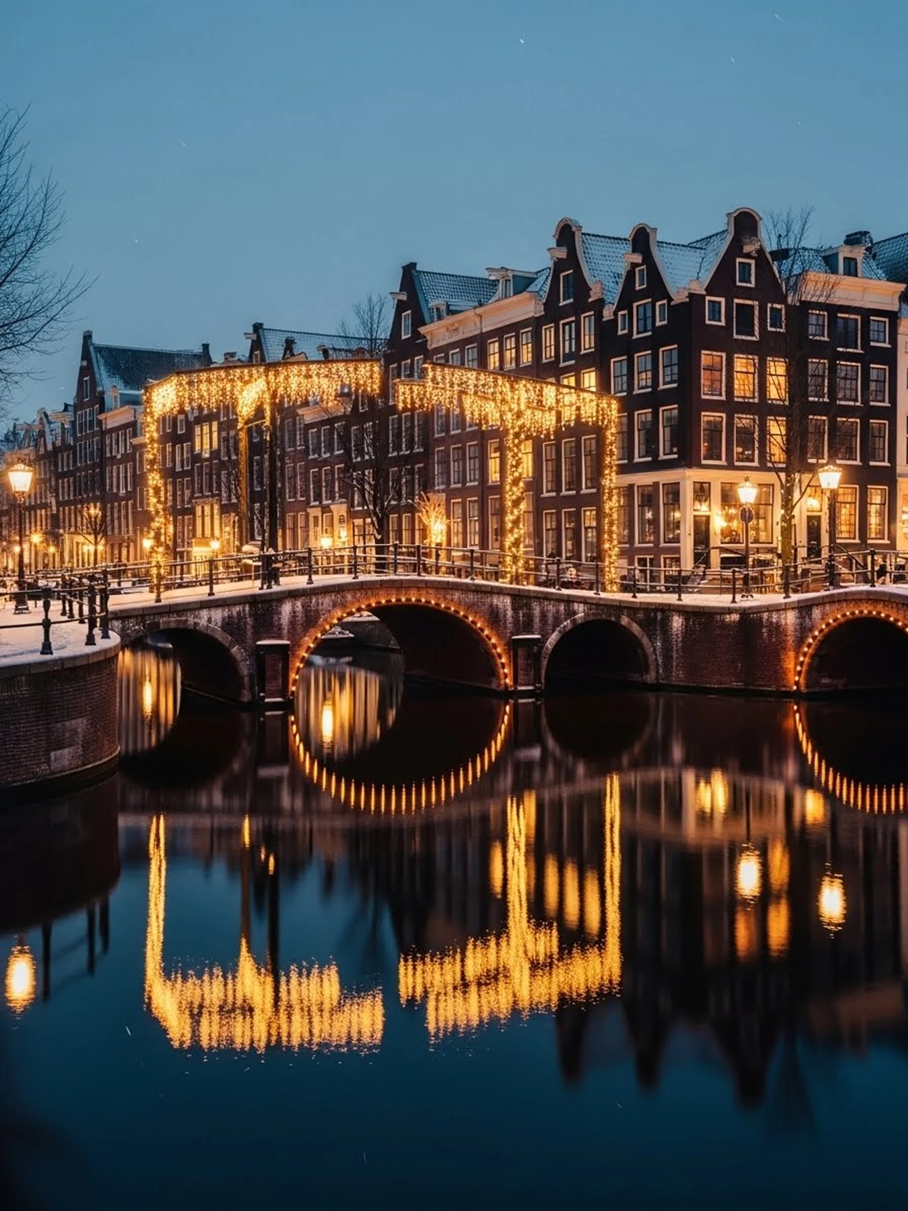 Los canales de Ámsterdam brillan durante el Amsterdam Light Festival, creando un paisaje perfecto para recorrer a pie o en barco. Sus mercados y cafeterías aportan un toque acogedor que hace que la ciudad sea encantadora en Navidad.